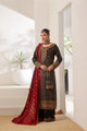 The black long shirt is masterfully adorned with antique gold dabka, zardozi, beads, and sequins, creating an alluring tapestry of texture and light. The red dupatta blooms with antique gold floral work, offering a regal contrast, while the black hijar is detailed with matching antique gold embellishments for a flawlessly coordinated finish.